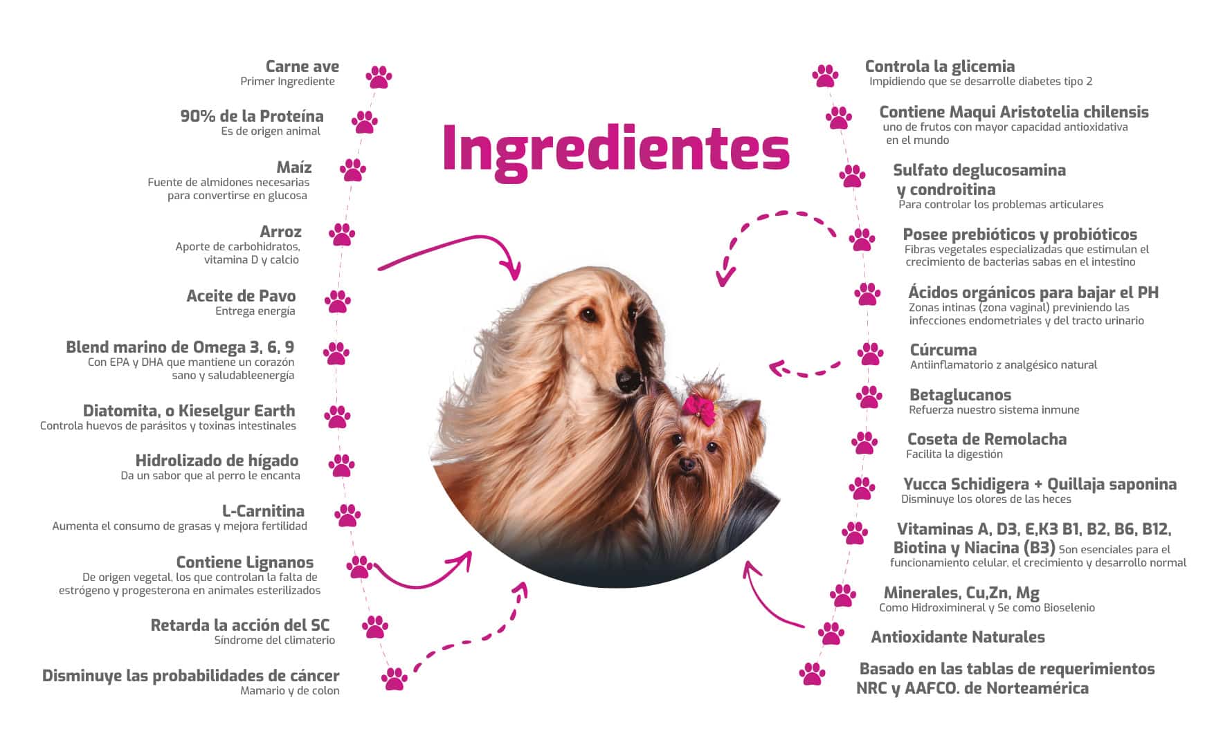 El mejor alimento para perritas tanto esterilizadas como fértiles, para todas las razas. Contiene 28% de proteína de carne, siendo un 90% de ella de origen animal. Disminuye la tendencia a engordar en perritas esterilizadas. Contiene Lignanos de origen vegetal, los que controlan la falta de estrógeno y progesterona en animales esterilizados. Retarda la acción del SC Síndrome del climaterio. Reduce los riesgos de enfermedades cardiovasculares, cáncer mamario, cáncer de colon y diabetes tipo 2 . Cuenta con ácidos orgánicos para bajar el PH en zonas intinas, previniendo las infecciones endometriales y del tracto urinario. Posee prebióticos y probióticos. También proporciona fibras vegetales especializadas que estimulan el crecimiento de bacterias sanas en el intestino, además de sulfato de glucosamina y condroitina para controlar los problemas articulares